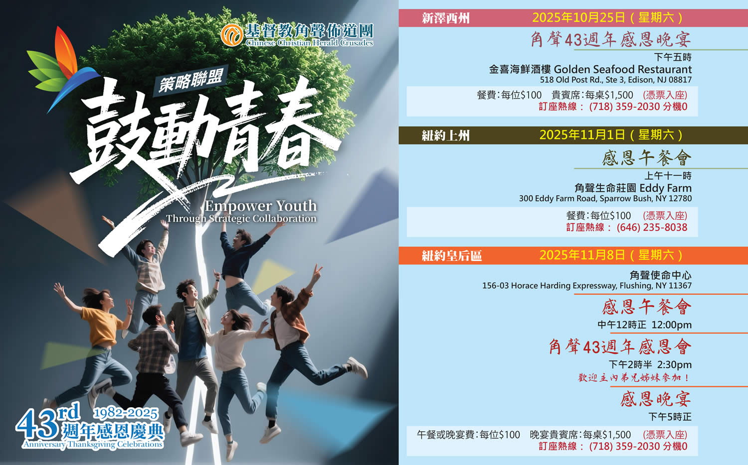今年,我們以「策略聯盟・鼓動青春」為主題,聚焦跨代同行、使命傳承,串連新澤西、紐約上州、皇后區三地感恩慶典,見證神如何讓不同世代、不同教會攜手同行,把福音的火再次點燃!