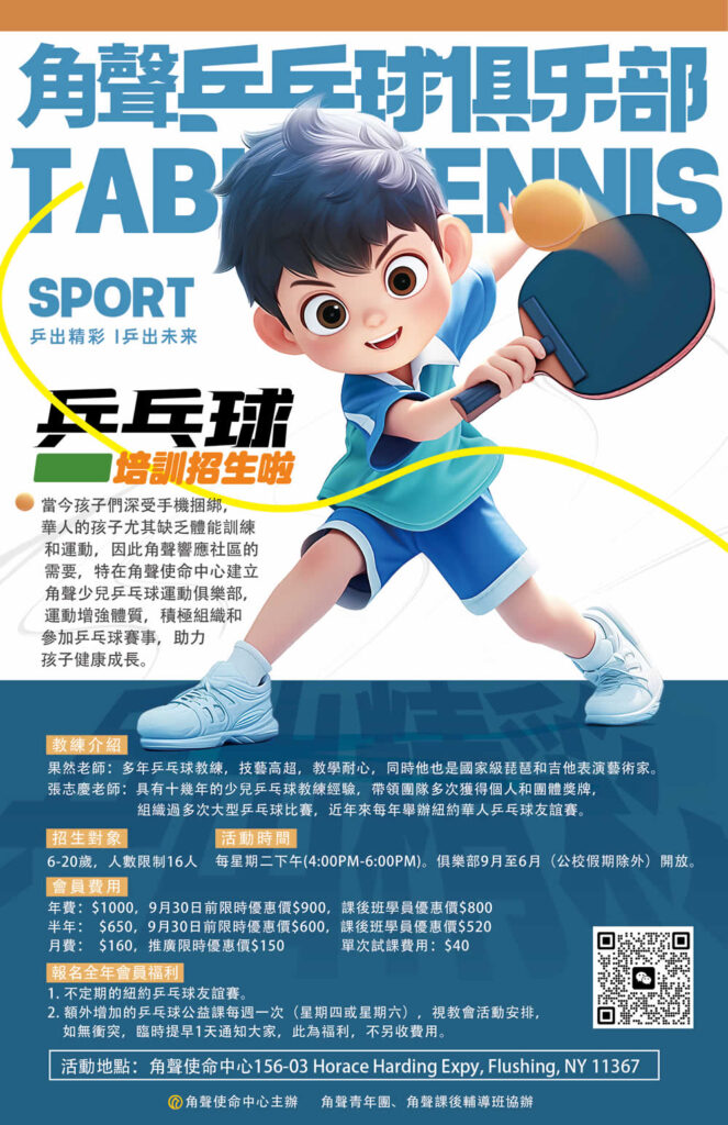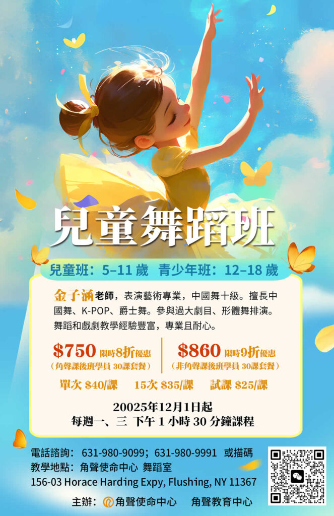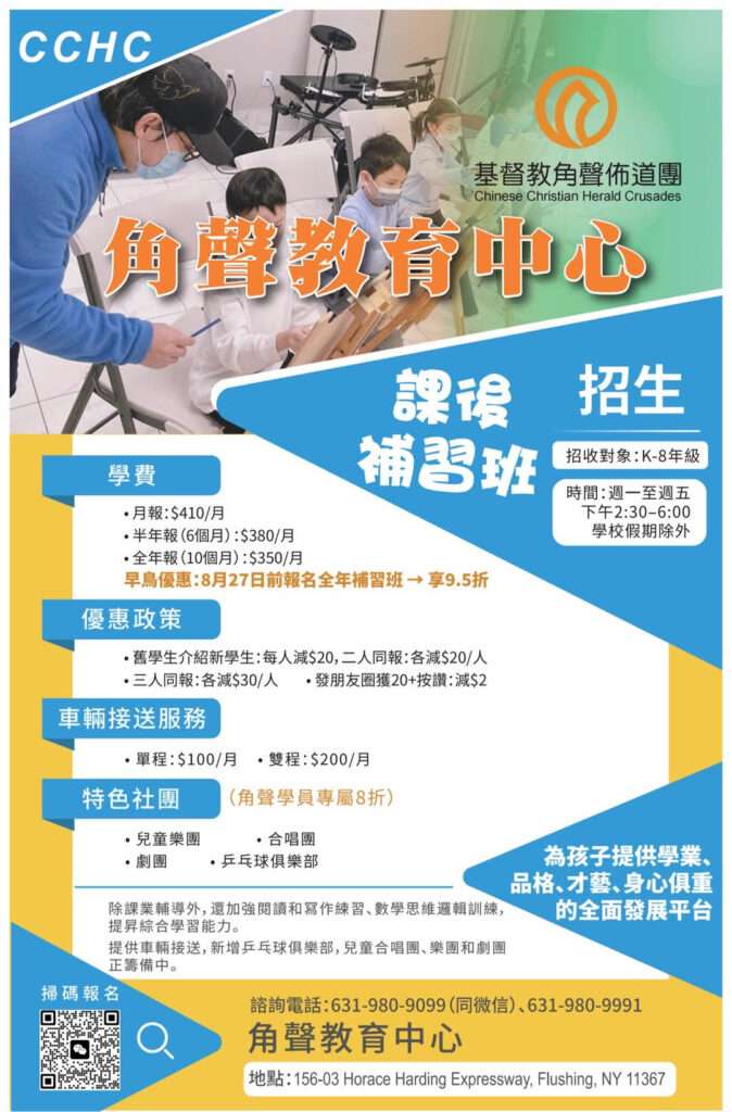 角聲教育中心 角聲教育中心,以全人發展的理念,為幼稚園至八年級孩子提供課後補習之餘,還提供各類活動(包括棋類、球類和遊樂,多彩星期五還有科學實驗、音樂、舞蹈、魔術、書法、烘培和手工等),并且提供模擬環境,建立財務系統,學生可申請工作,取得工資並納稅,收入可購買商品和服務,參與拍賣會和捐款,培養學生理財與溝通技能,玩出品格力。 日期:每星期一至五,下午2:30至6:00 年齡:K-8年級 聯絡電話:631-980-9099(同微信)、631-980-9991
