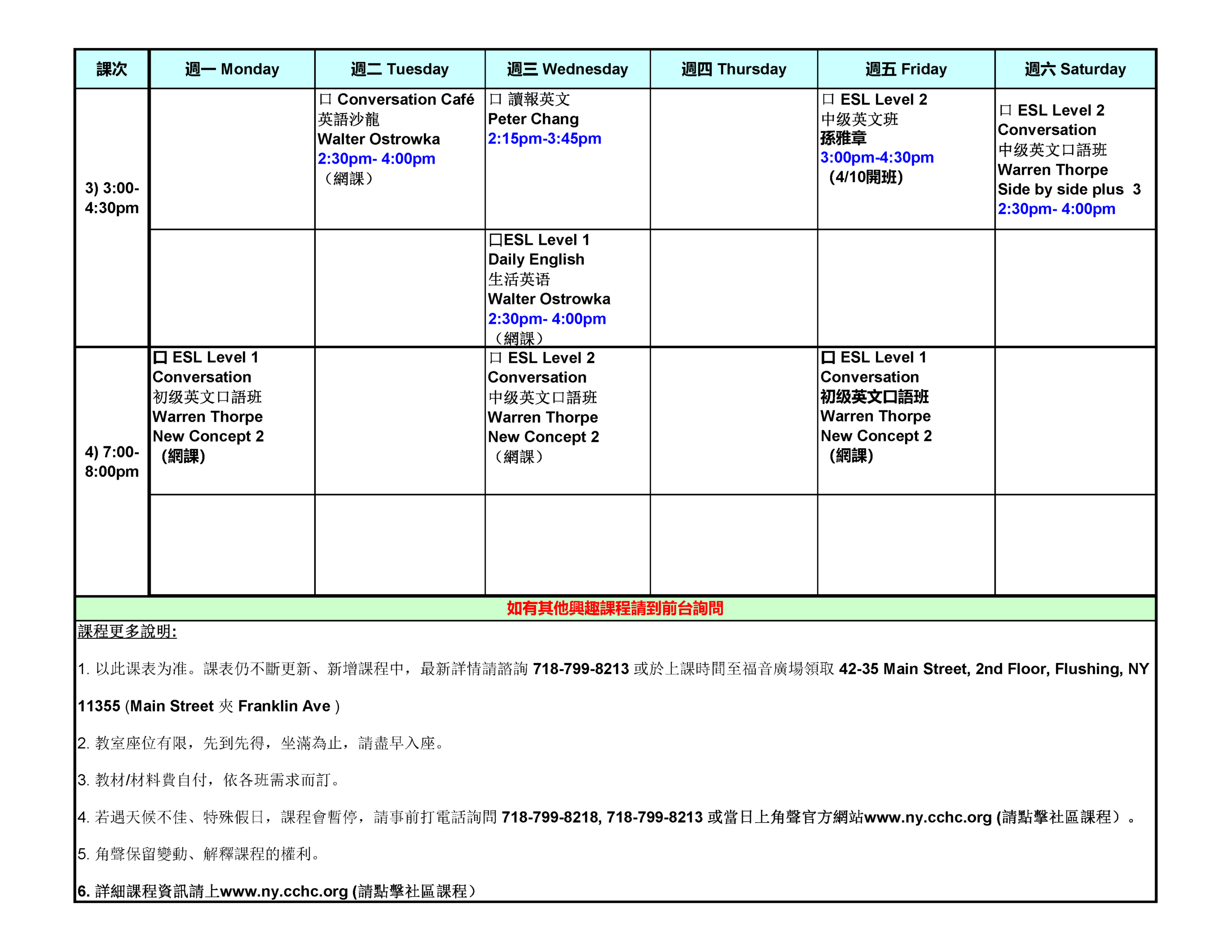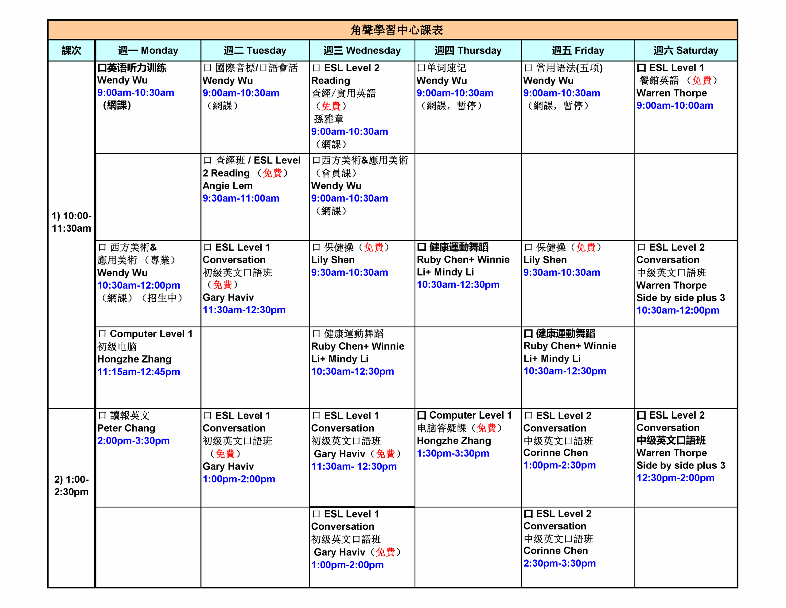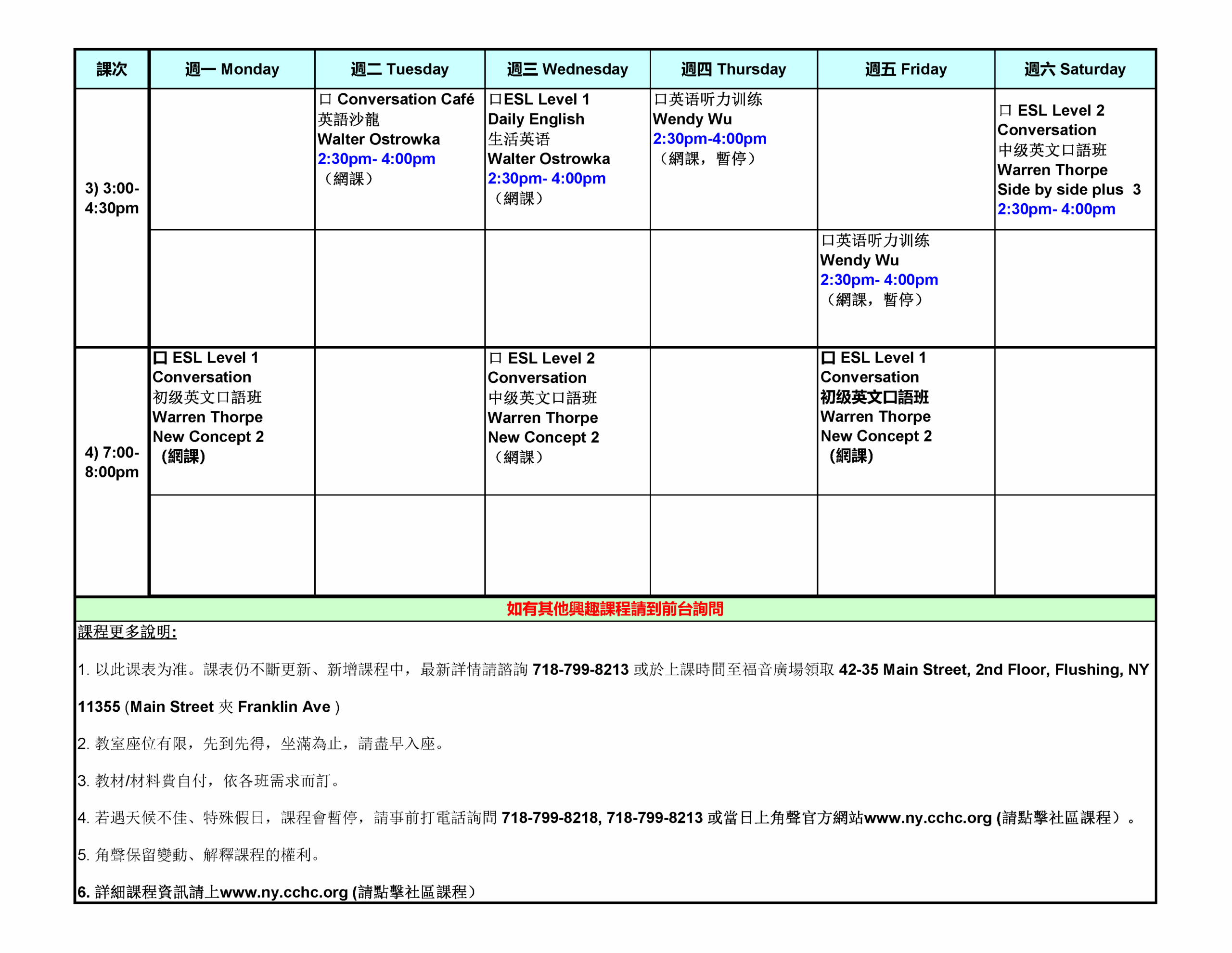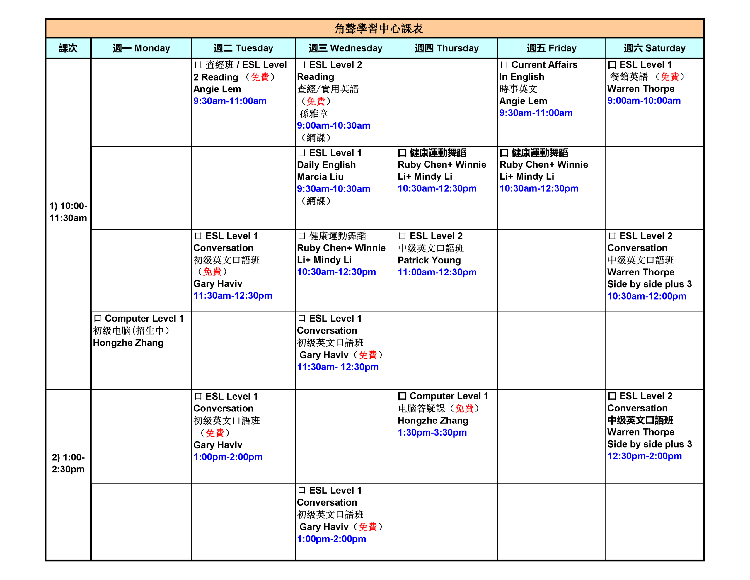 為更好幫助有需要的社區民眾,開設了免費英文班,時間為每週二上午9:30-11:00; 每週三上午9: