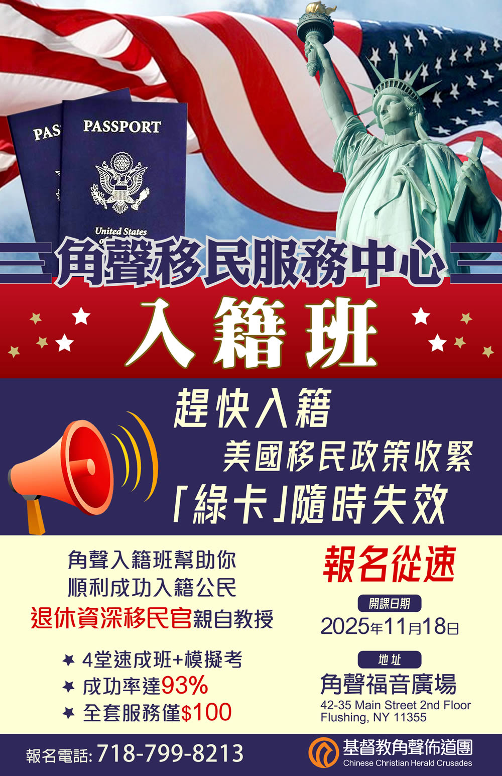 ‘現在正是最關鍵的時刻!移民政策日趨收緊,綠卡隨時可能失效,不要讓機會白白溜走。角聲特別推出入籍班,由退休資深移民官親自授課,帶你快速掌握考試重點,實戰模擬一應俱全,幫助你輕鬆應考,安心拿下公民身份。