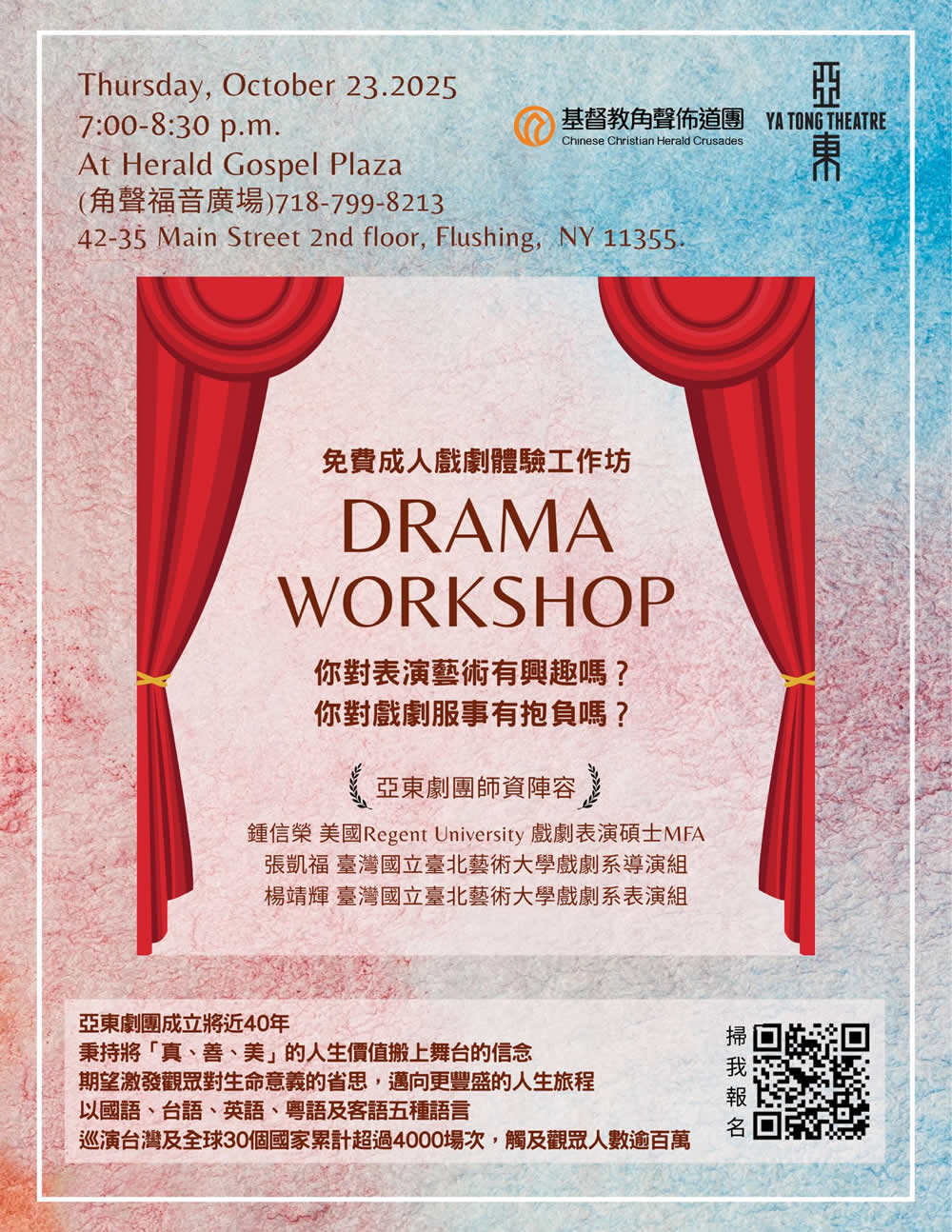 亞東劇團將於 10月23日(週四)晚7:00–8:30 於 角聲福音廣場舉辦一場免費成人戲劇體驗工作坊,由專業導師團隊親自帶領,帶你從表情、肢體到情感,感受戲劇的魅力與靈魂的釋放。