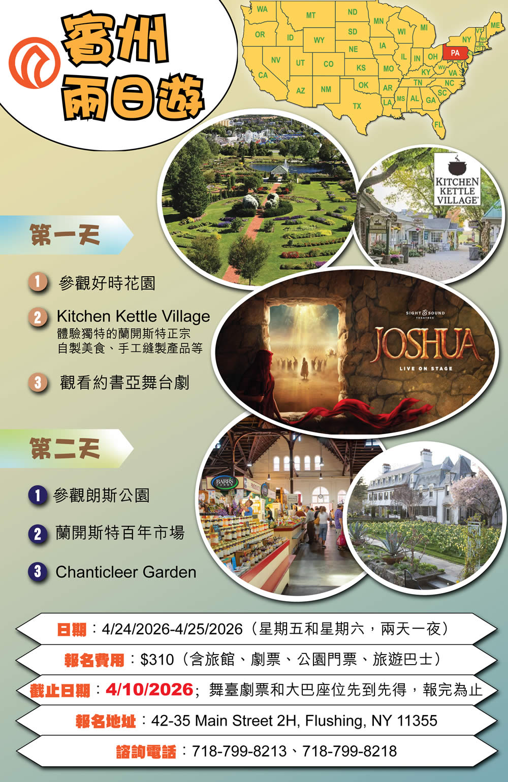 角聲誠邀你參加「賓州兩日遊」,結合自然景觀、特色小鎮與信仰藝術,一次走訪好時花園 (Hershey Gardens)、Kitchen Kettle Village、蘭開斯特百年市集 (Lancaster Central Market),並欣賞震撼人心的約書亞舞台劇。行程安排舒適,交通、住宿與門票一次搞定,適合朋友同行、夫妻同遊,或給自己一段靜心整理的時間。在旅途中放慢腳步,看見美景,也重新得力。