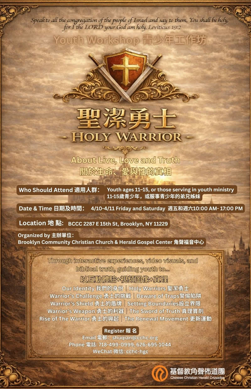 在這個充滿挑戰與誘惑的世代,青少年更需要清楚的價值與方向。「聖潔勇士 Holy Warrior」青年工作坊,透過互動體驗、影音內容與聖經教導,幫助年輕人認識身份、建立界線,並在生活中活出真理與愛。