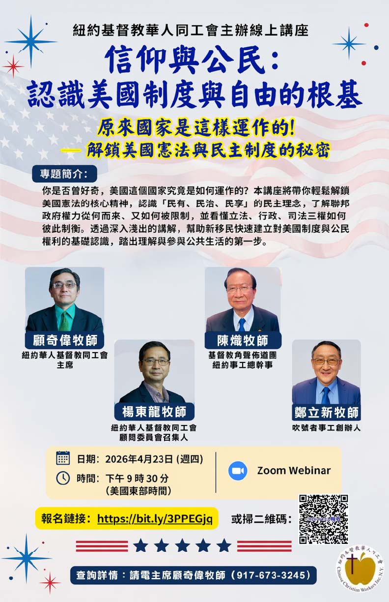 本講座以「信仰與公民」為主題,帶你深入認識美國制度與自由的根基,從憲法精神到民主理念,幫助你理解「民有、民治、民享」背後的核心價值,並看懂立法、行政、司法三權如何彼此制衡。