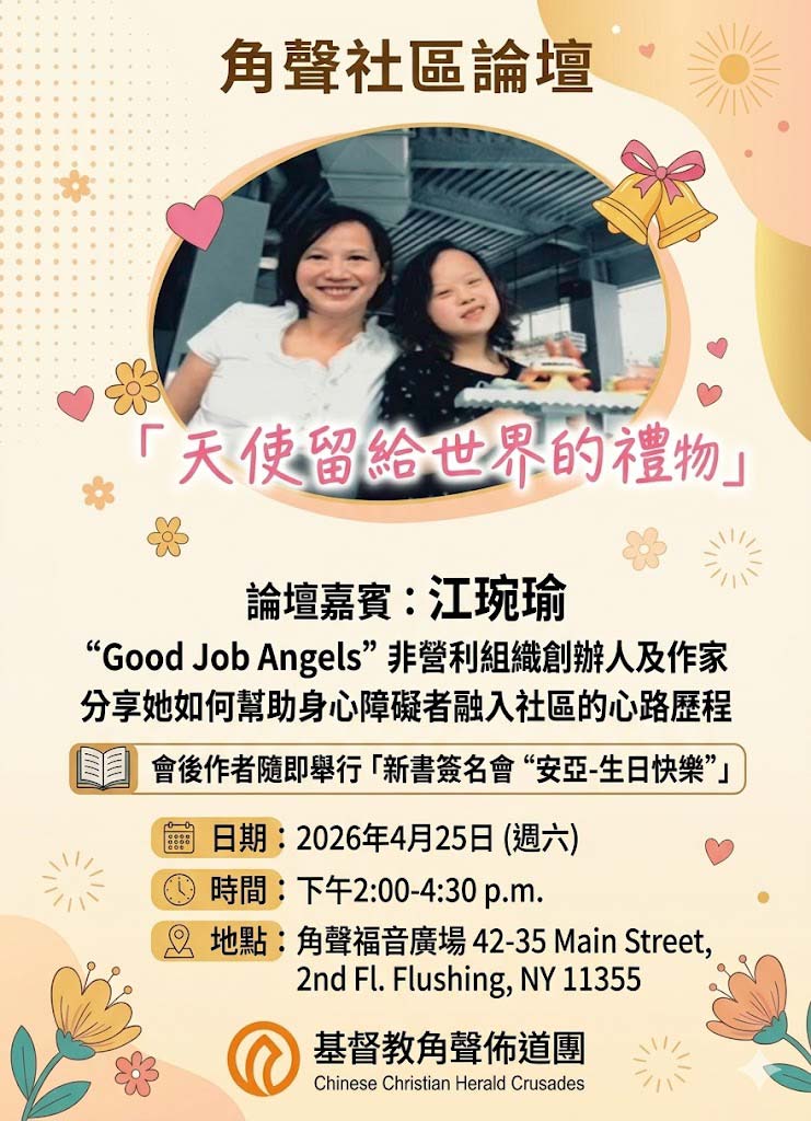 角聲社區論壇誠邀您參加「天使留給世界的禮物」,由 “Good Job Angels” 非營利機構創辦人及作家江琬瑜親自分享,帶你走進身心障礙者融入社區的心路歷程,看見每一個生命的價值與可能。