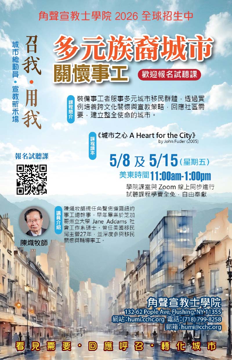 角聲宣教士學院誠意推出「多元族裔城市關懷事工」課程,透過實例教學,幫助事工者建立跨文化關懷與宣教策略,回應城市中不同族群的實際需要。