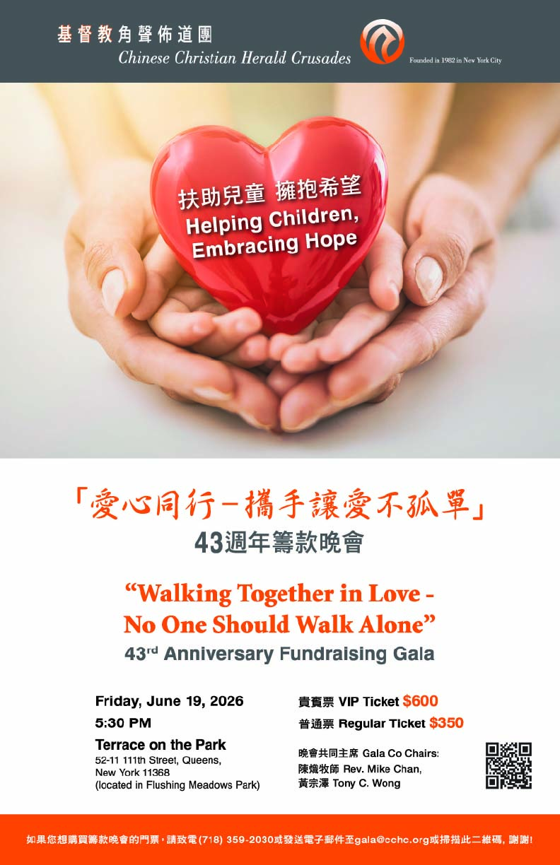 今年,我們誠意邀請您出席「愛心同行・攜手讓愛不孤單」43週年籌款晚宴,一同見證神的作為,並參與一場真正改變生命的行動。