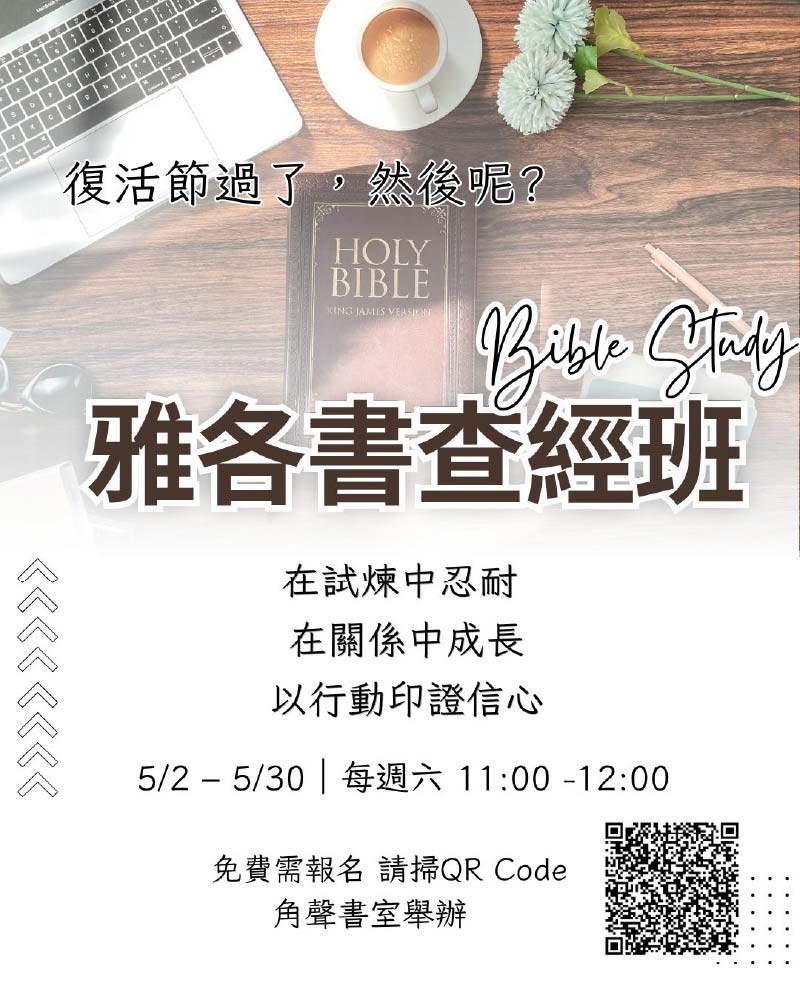 「雅各書查經班」邀請你一起深入經文,在真實生活中學習忍耐、成長與行動。透過每週的查經與分享,幫助你在試煉中站立得穩,在關係中成熟,並以行動印證信仰。