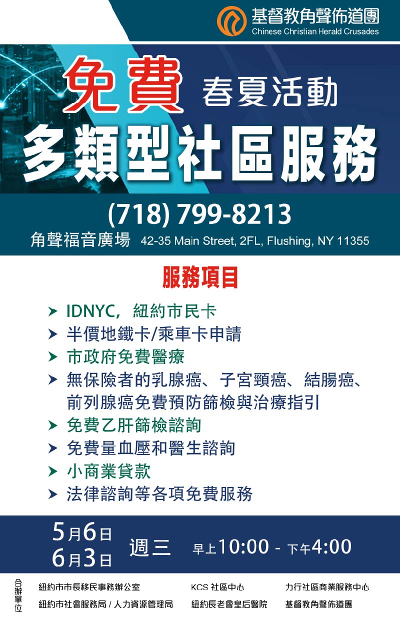 角聲春夏推出「免費多類型社區服務」,為社區居民提供一站式支援,包括醫療、法律、交通補助及政府資源申請等,幫助你更安心地生活在紐約。